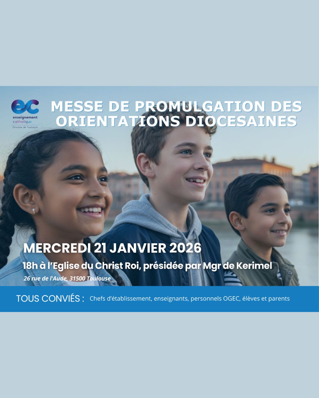 Enseignants, personnel, élèves, parents, nous sommes tous conviés à cette invitation à 18h en l’église du Christ Roi (26, rue de l’Aude à Toulouse).
