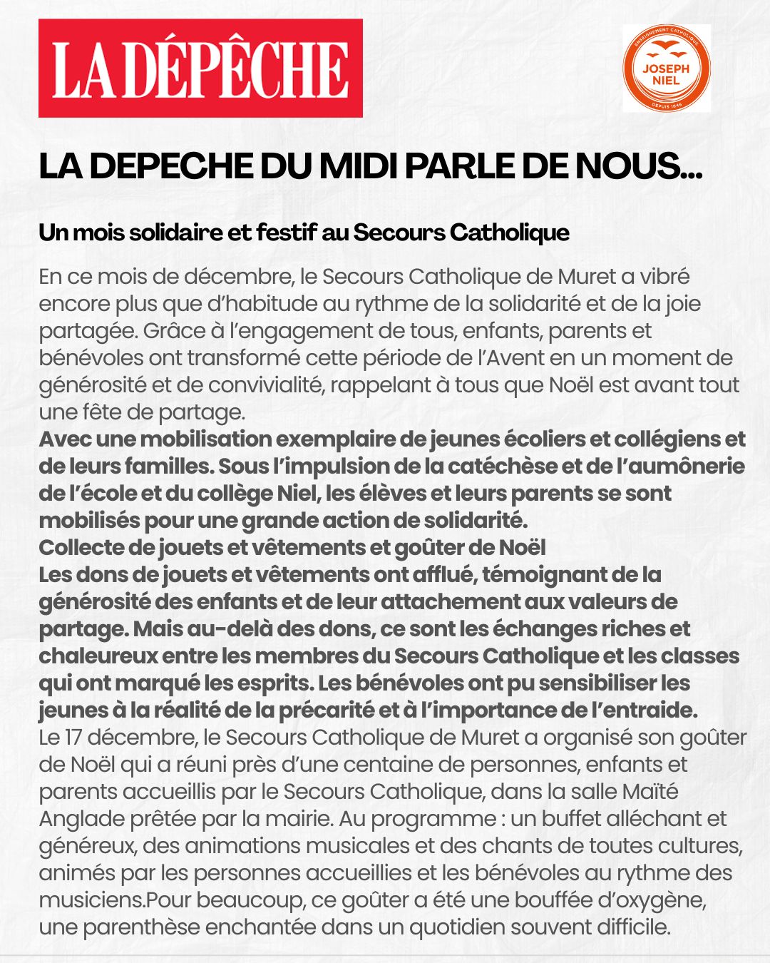 Le 23 décembre 2025, la Dépêche du Midi a mis à l’honneur l’action du Secours catholique pendant le temps de l’Avent, en soulignant la belle mobilisation des élèves et de leurs familles de l’établissement Joseph Niel à l’occasion d’une collecte de jouets et de vêtements. Un grand merci à tous pour cet engagement solidaire, reflet des valeurs de partage et de générosité de notre établissement.